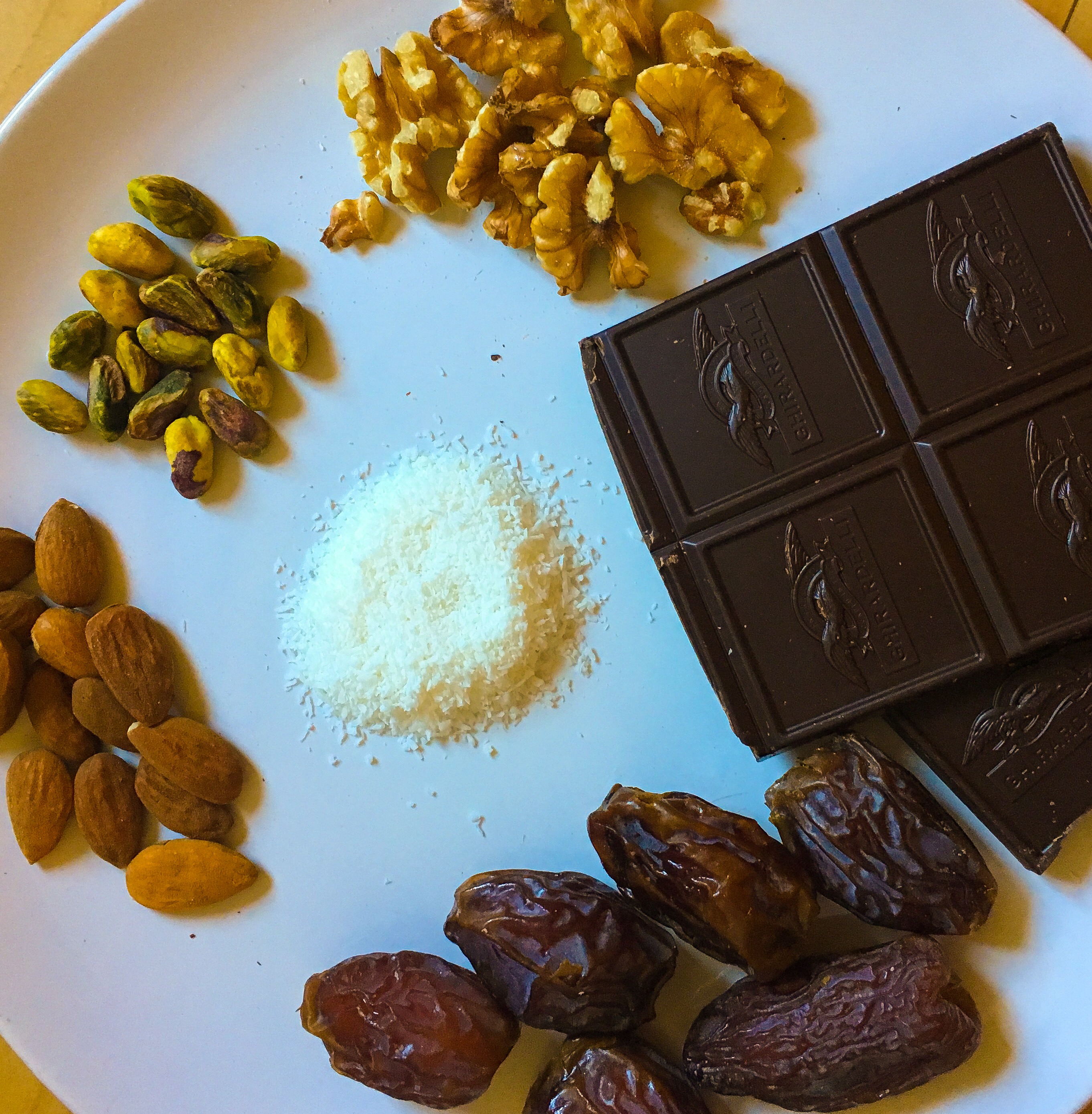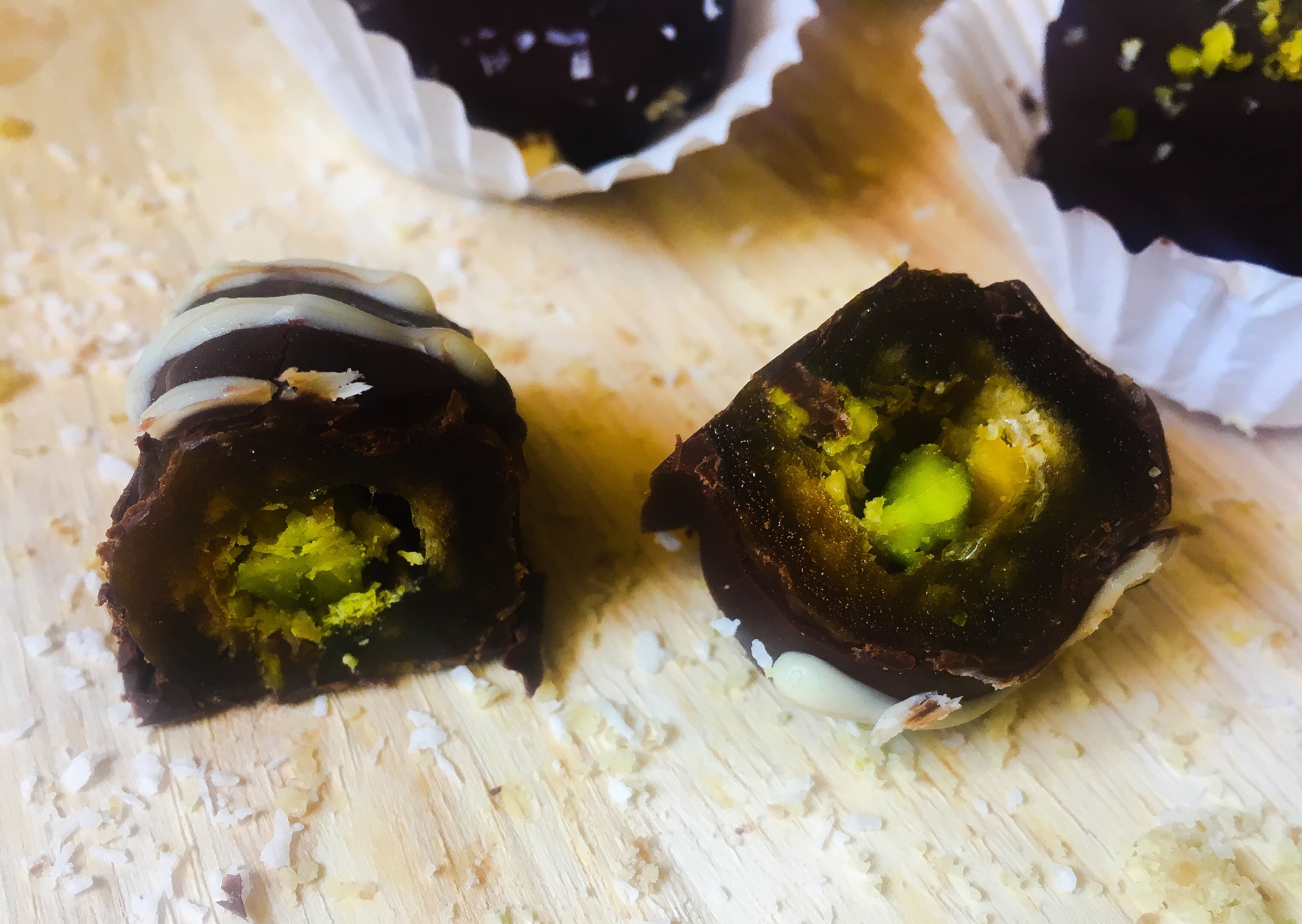 All you do is remove the pit from each date, and slide in your favorite dry fruit (I have used pistachio and walnuts). Then dunk each date in a hot tub of warm, organic dark chocolate.