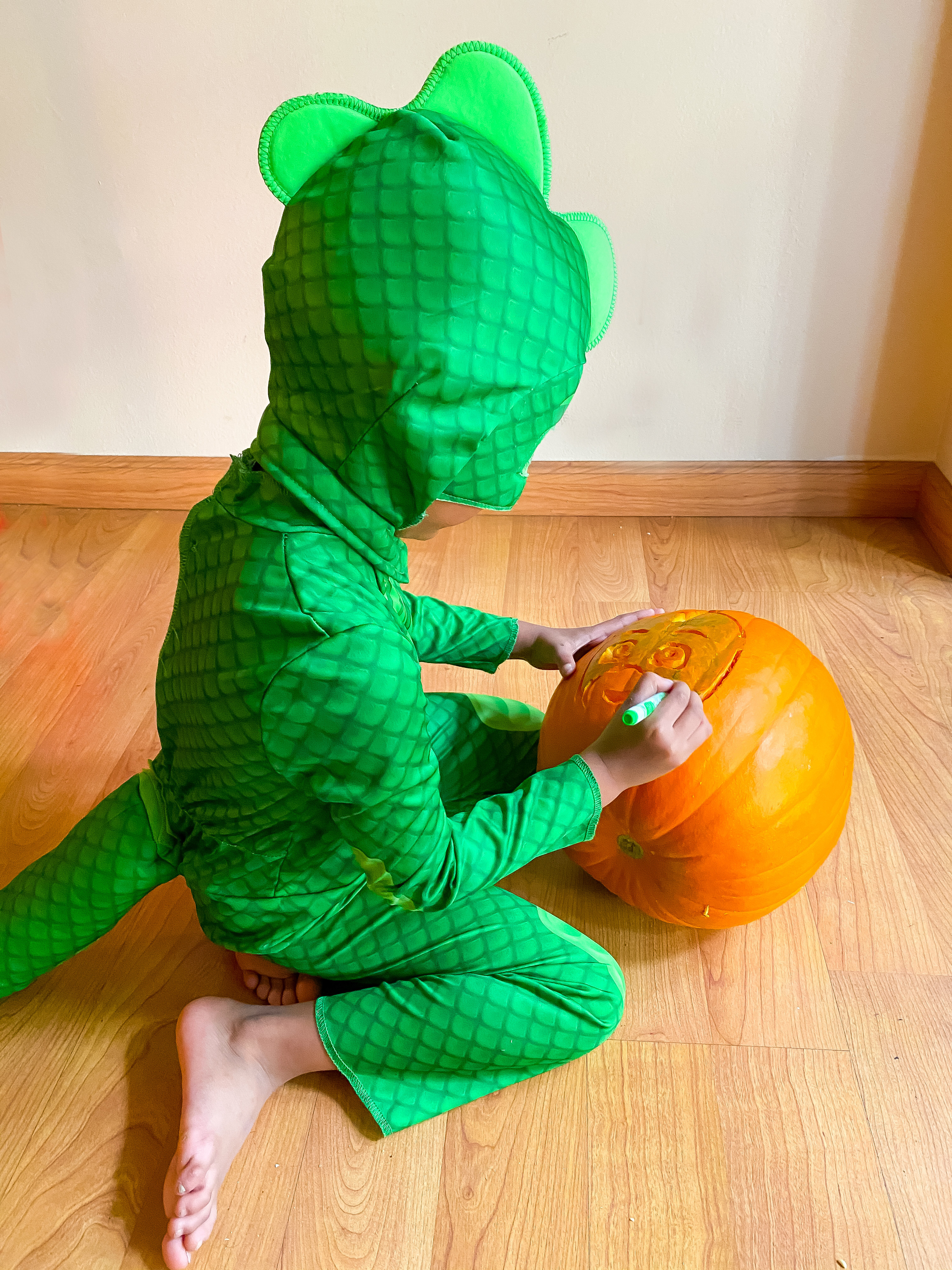 Halloween is incomplete without carving pumpkins. This year, you can carve your Halloween pumpkins inspired by your kiddo’s favorite PJ Masks hero thanks to these fun stencils. Because Aareeb was wearing a Gekko costume, we carved Gekko on his pumpkin and it was so easy to do with the help of stencils. You can download FREE PJ Masks Pumpkin Carving Stencils here.