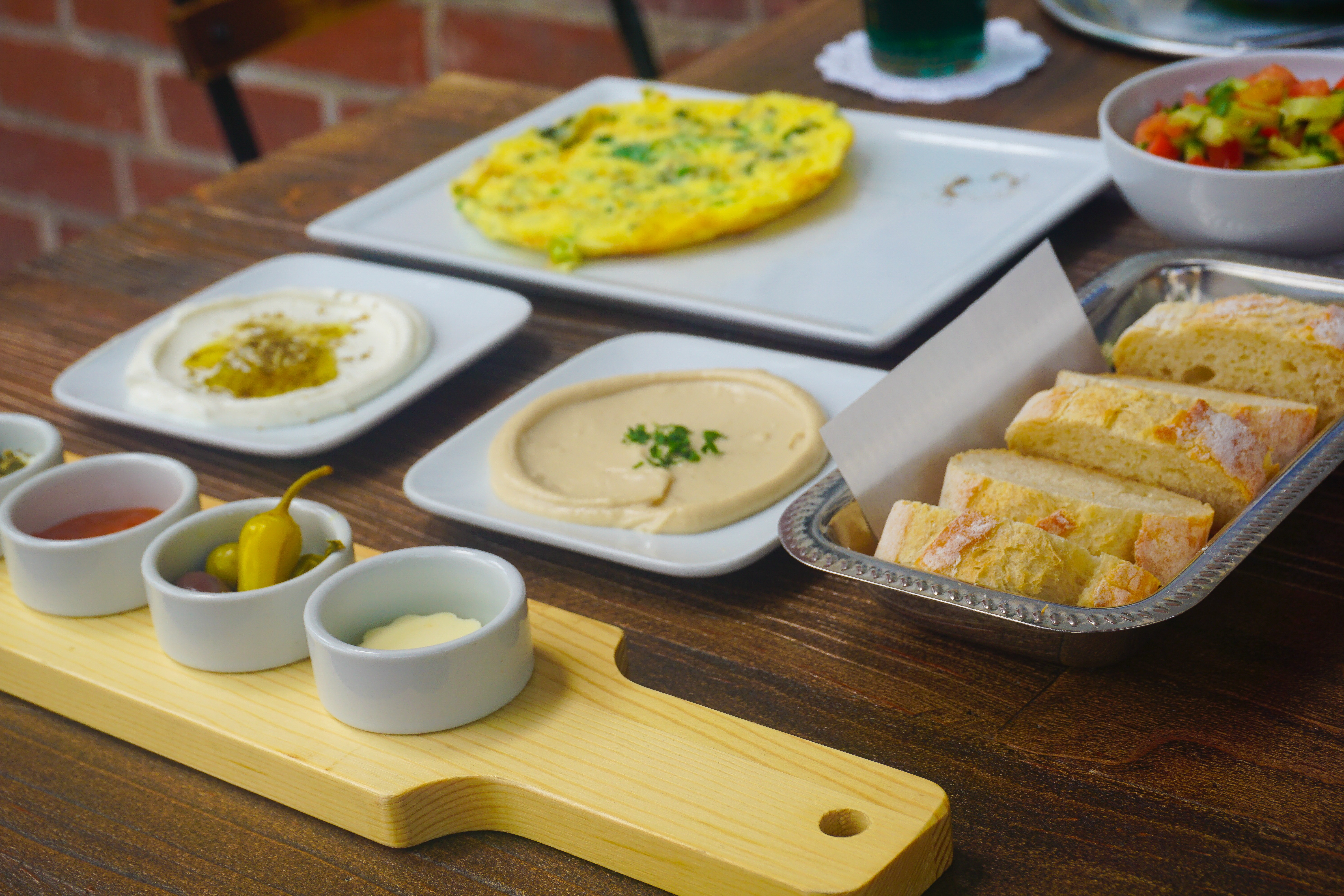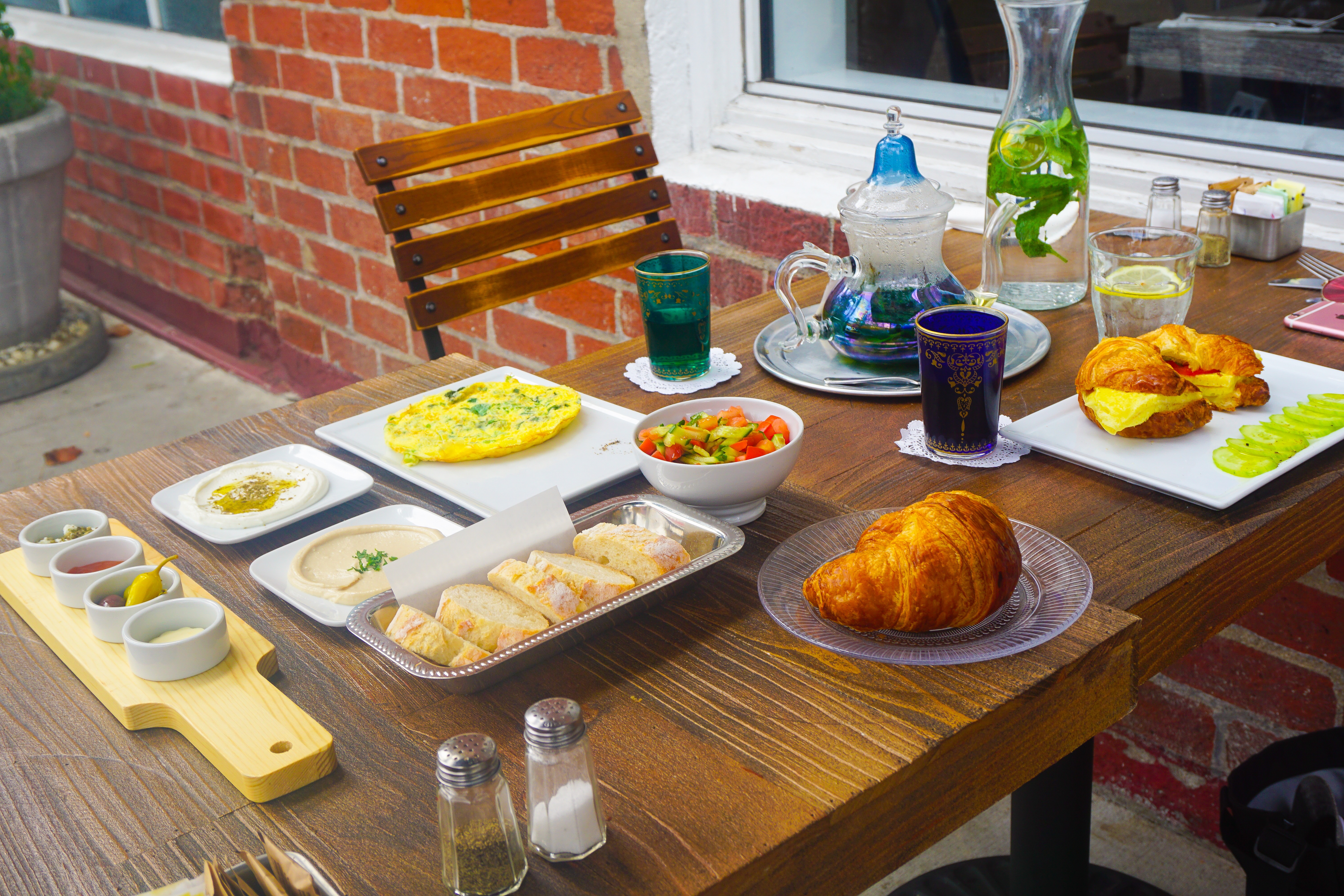 Israeli Breakfast – It is a platter of two eggs of any style (I choose omelette) with Chopped Israeli Salad, Olives, Feta Cheese, Tahini, Labne, Jam, served with Baguette/Whole Wheat Bread, House Lemonade, & Organic Coffee