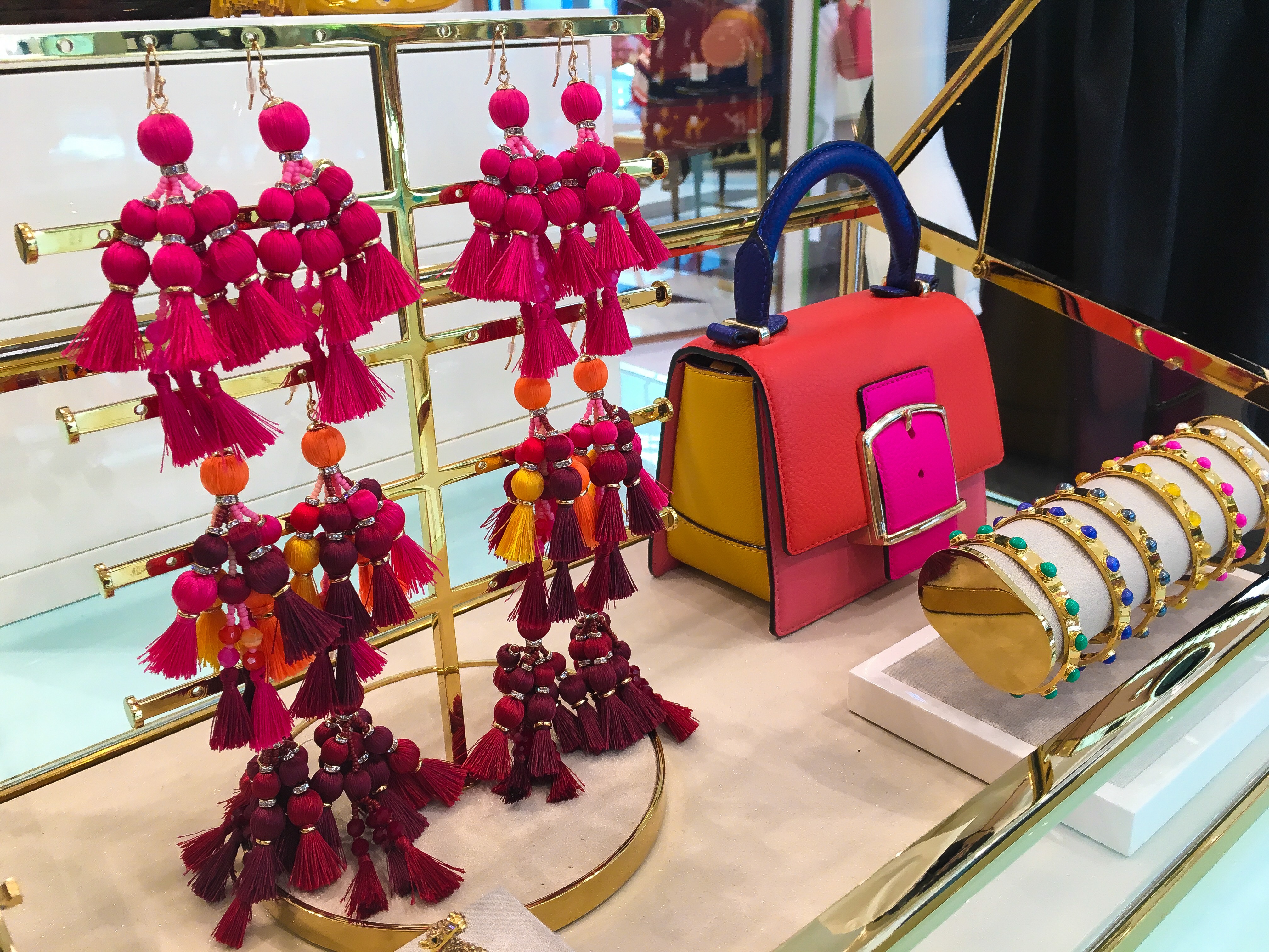 The vibrant colors, tassels and poms put me in the mood for a party. My favorite pieces are the earrings and the small color blocked bag pictured next to it. Those really caught my eye!