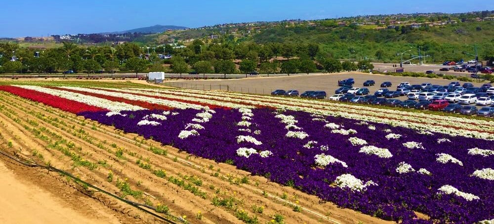 The Flower Fields opens up once a year in spring from March 1 through May 10. The area has a number of attractions, including its Tecolote Giant Ranunculus, a greenhouse filled with cymbidium orchids, a 279-by-147-foot American flag made out of red, white, and blue petunias, musical events and Educational tours for both children and adults.